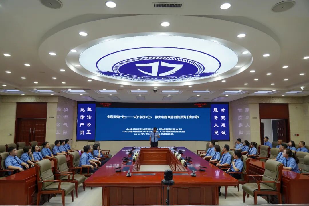 一抹红,绘就百年辉煌;一袭蓝,书写忠诚篇章。为庆祝中国共产党成立104周年,推动深入贯彻中央八项规定精神学习教育走深走实,引导检察干警筑牢信仰之基、补足精神之钙、把稳思想之舵,7月1日,锦州经济技术开发区人民检察院党支部联合锦州市城郊地区人民检察院党支部全体党员干警前往锦州监狱,开展一次主题鲜明、内容深刻的“铸魂七一守初心 狱镜明廉践使命”主题党日活动。通过沉浸式警示教育与庄严的党性锤炼,为全体干警上了一堂触及灵魂的特殊党课。